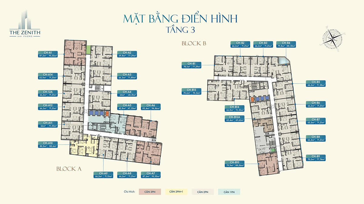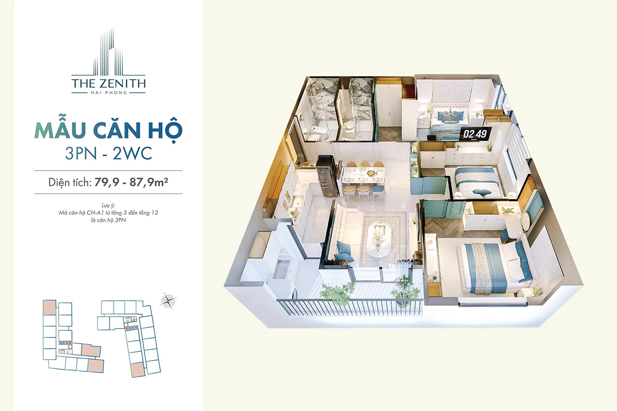 - Căn 3 PN : Diện tích từ 79,9 – 87,9m²
